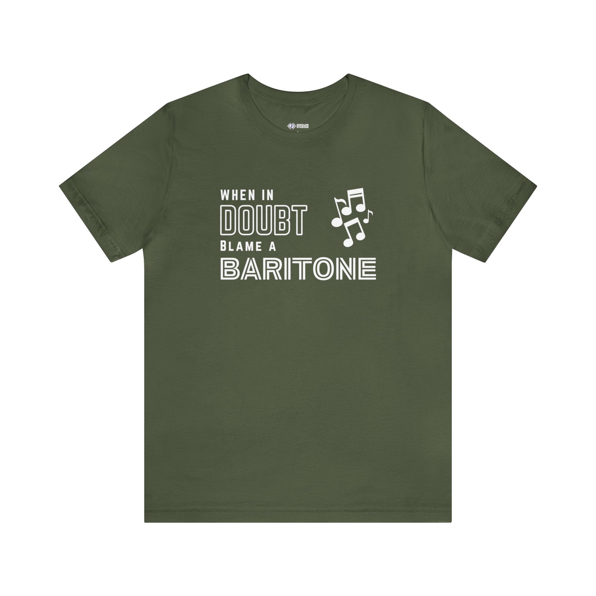 Indulge in the humor of harmonies with Zeagler Studios' exclusive "When in Doubt, Blame a Baritone" T-shirt! Crafted with a dash of wit and a touch of camaraderie, this shirt is a playful nod to the role of baritones in the delightful blame game.